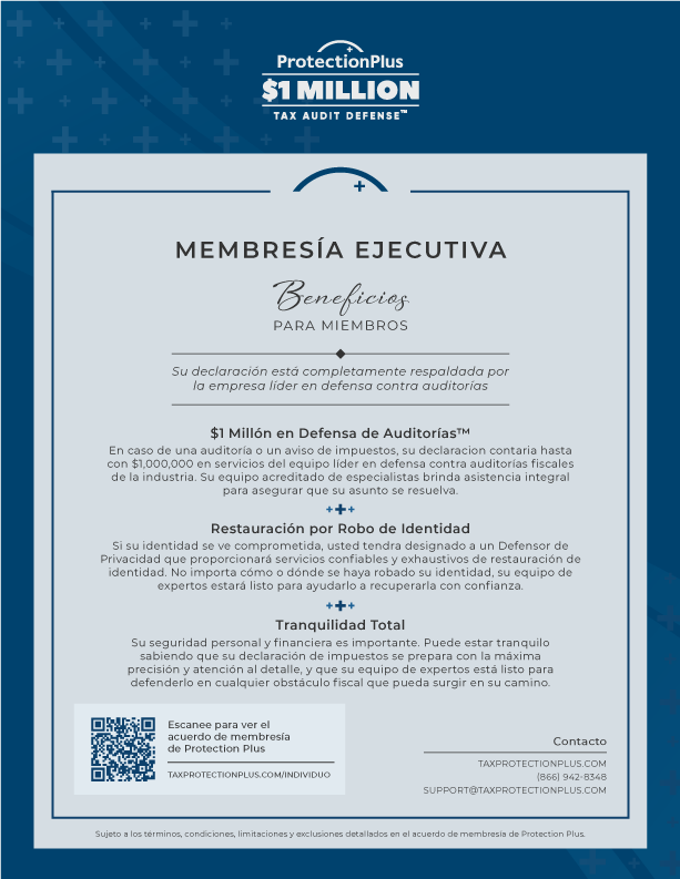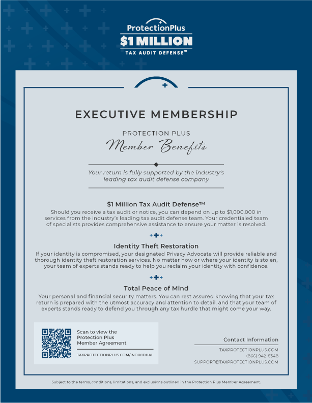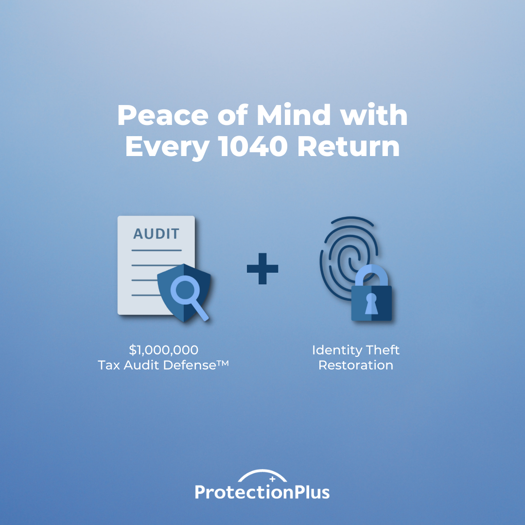 When you file your 1040 tax return with us, you'll automatically have access to Protection Plus, the leading tax audit defense and identity theft restoration service. So, breathe easy. We've got you covered.