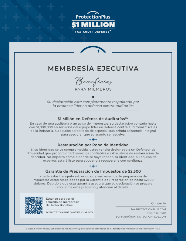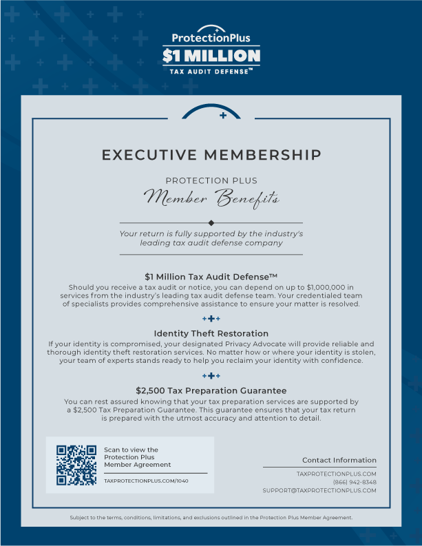 When you file your 1040 tax return with us, you'll automatically have access to Protection Plus, the leading tax audit defense and identity theft restoration service. So, breathe easy. We've got you covered.