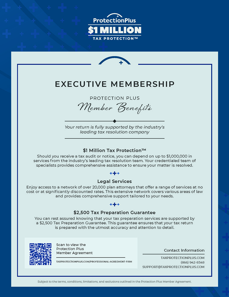 Protection Plus is our premier partner for tax audit defense and identity theft restoration. If you receive a tax notice from the state or IRS, you can rest assured that you'll have an experienced team on your side