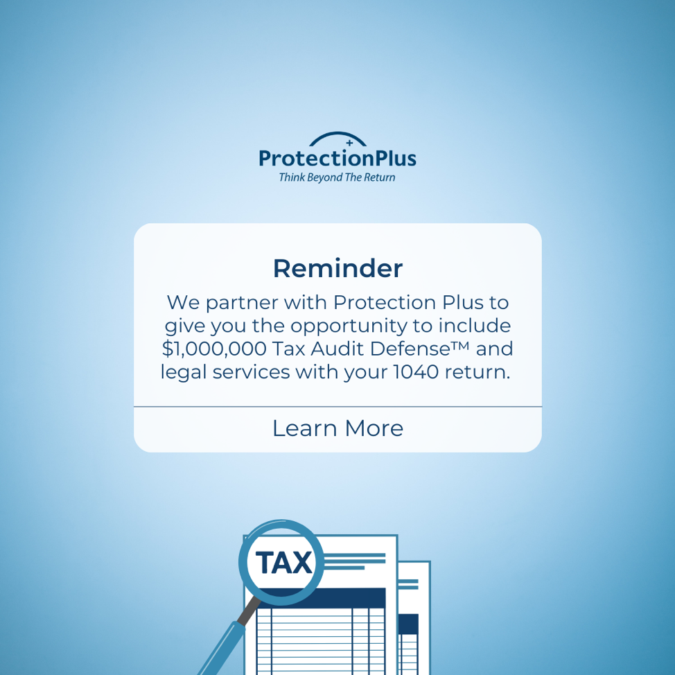 Our partners at Protection Plus provide $1 Million Tax Audit Defense plus, discounted and free legal services. Ask how you can include these helpful resources to your 1040 return!